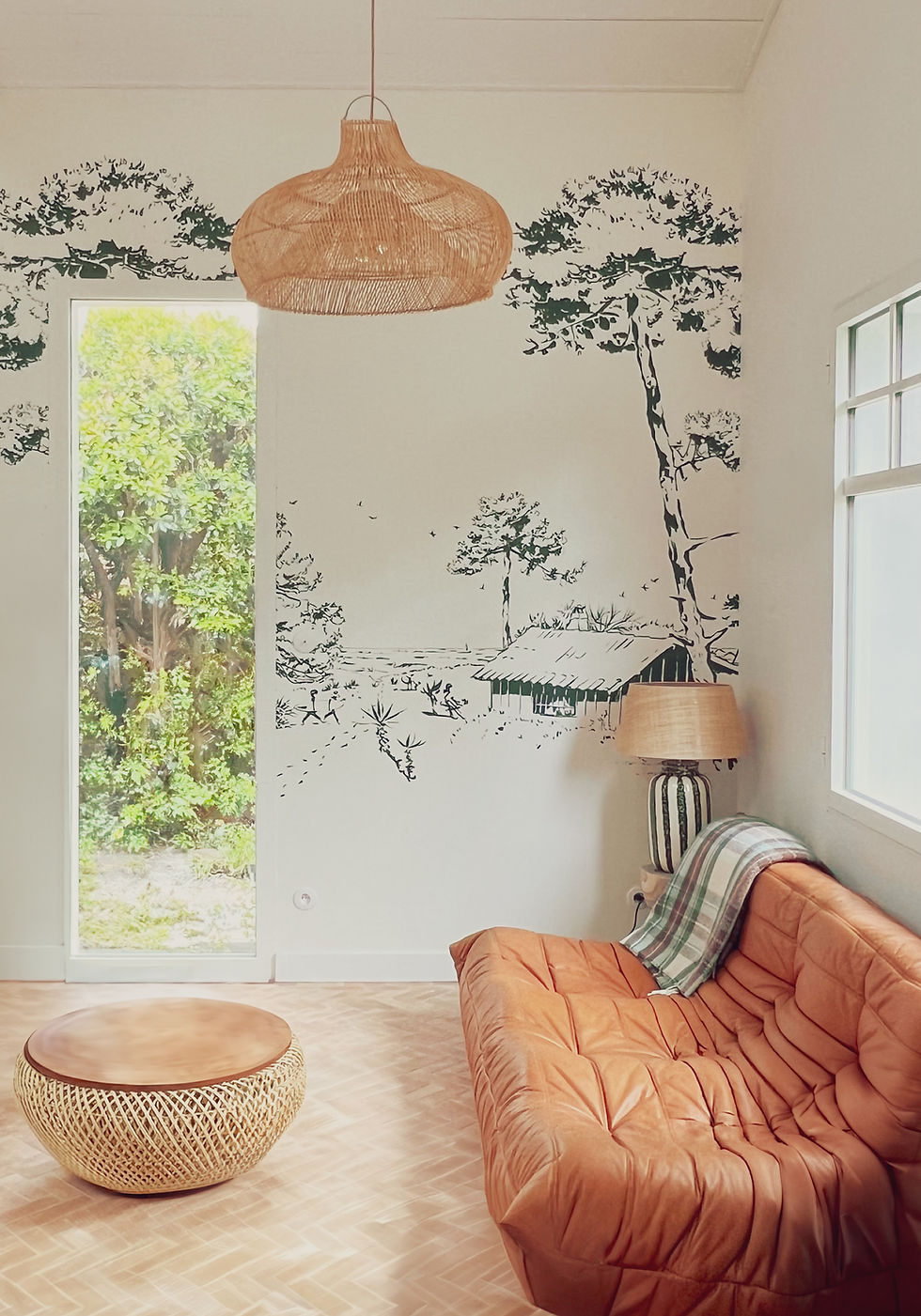 Les matières utilisées, telles que le bejmat, le zellige, le parquet contrecollé de fabrication locale et la céramique, apportent une touche d'authenticité et de chaleur. Les motifs des papiers peints panoramiques, tous éco-conçus, ajoutent une dimension visuelle captivante, tandis que les éléments de mobilier et de décoration ont été principalement chinés.