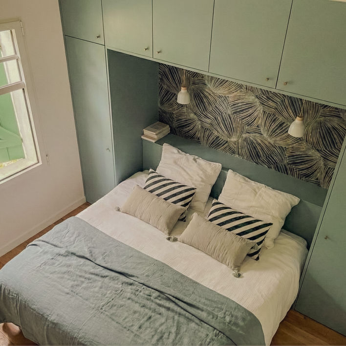 La conception du mobilier sur mesure a inclus la création de deux dressings, de ponts de lits, d'un vestiaire, et de placards pour la cuisine, permettant ainsi de répondre aux besoins spécifiques des clients. Un book déco a été constitué, accompagné d'une liste shopping détaillée, afin de guider les clients dans leurs choix et de leur offrir une vision claire de l'ensemble du projet.